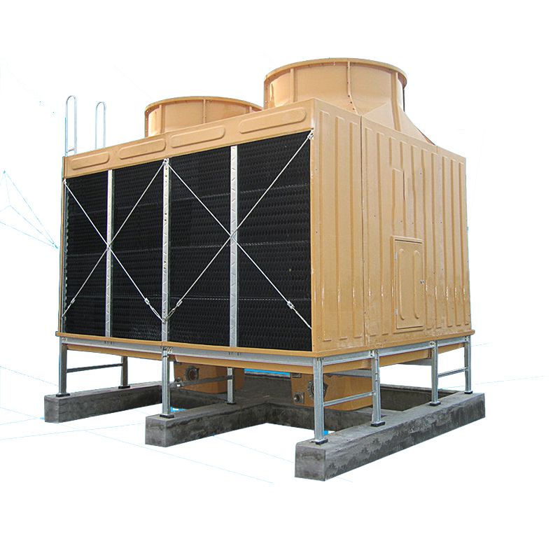 方形橫流式玻璃鋼冷卻塔采用兩側(cè)進風,靠頂部的風機,使空氣經(jīng)由塔兩側(cè)的填料,與熱水進行介質(zhì)交換,濕熱空氣再排向塔外。填料采用兩面有凸點的點波片,通過安裝頭使點波片粘結(jié)成整體,以提高剛性,兩面的凸點還可避免直接滴水,因此提高了水膜形成能力,填料尾部設(shè)有收水措施。