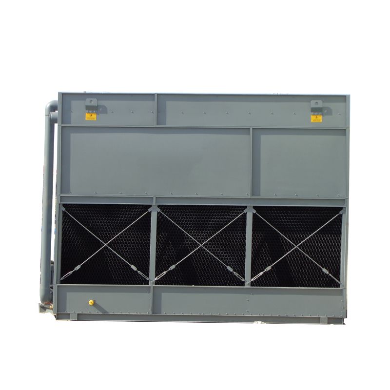 方形橫流式玻璃鋼冷卻塔采用兩側進風,靠頂部的風機,使空氣經由塔兩側的填料,與熱水進行介質交換,濕熱空氣再排向塔外。填料采用兩面有凸點的點波片,通過安裝頭使點波片粘結成整體,以提高剛性,兩面的凸點還可避免直接滴水,因此提高了水膜形成能力,填料尾部設有收水措施。