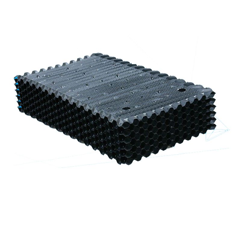 方形橫流式玻璃鋼冷卻塔采用兩側進風,靠頂部的風機,使空氣經由塔兩側的填料,與熱水進行介質交換,濕熱空氣再排向塔外。填料采用兩面有凸點的點波片,通過安裝頭使點波片粘結成整體,以提高剛性,兩面的凸點還可避免直接滴水,因此提高了水膜形成能力,填料尾部設有收水措施。